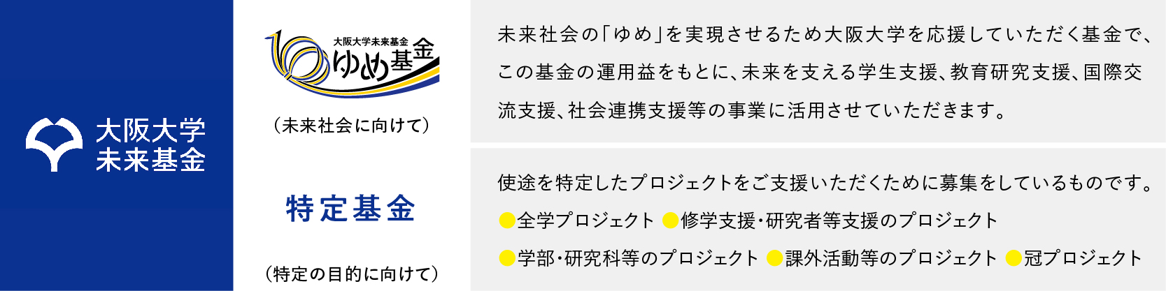 大阪大学未来基金には、「ゆめ基金」と「特定基金」があります。